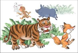 الثعلب. وكم كانت الدهشة في عيني النمر كبيرة أمام مشهد الحيوانات وهي تفرّ من أمام